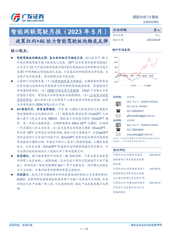 【广发证券】【20230626】智能网联驾驶月报(2023年5月):政策红利+AI助力智能驾驶板块触底反弹-14页