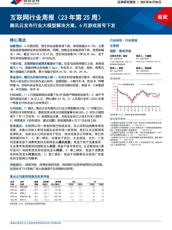 【国信证券】【20230628】20230628-国信证券-互联网行业周报(23年第25周):腾讯云发布行业大模型解决方案,6月游戏版号下发-12页