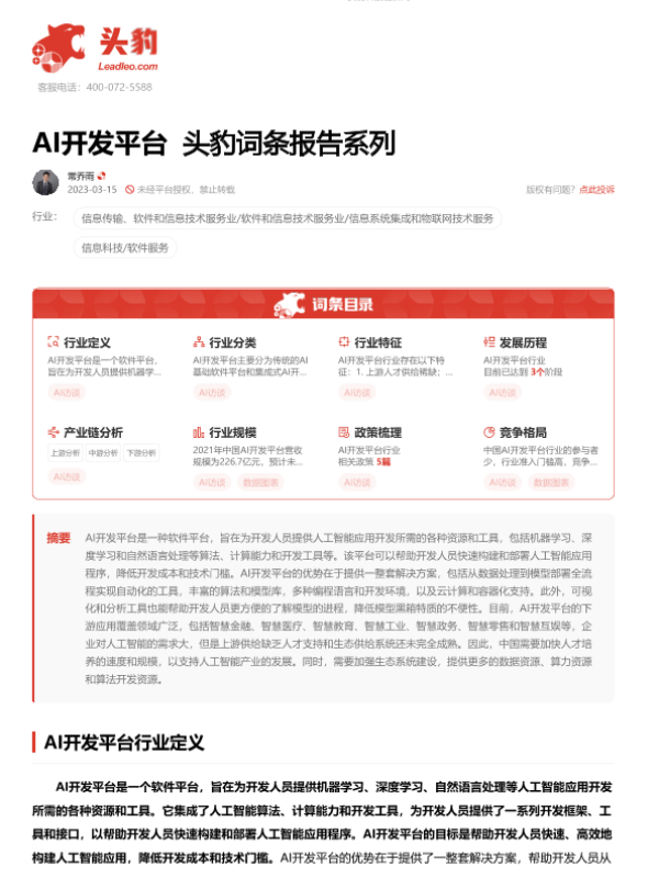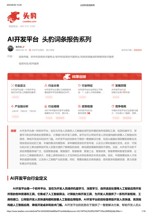 【头豹研究院】【20230626】AI开发平台 头豹词条报告系列-18页