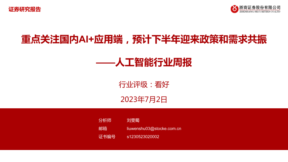 【浙商证券】【20230702】20230702-浙商证券-人工智能行业周报:重点关注国内AI+应用端,预计下半年迎来政策和需求共振-17页