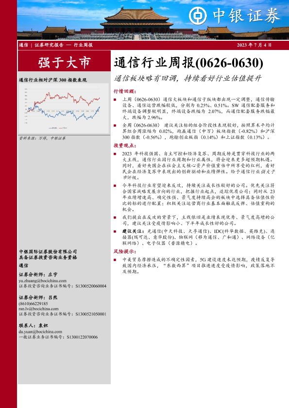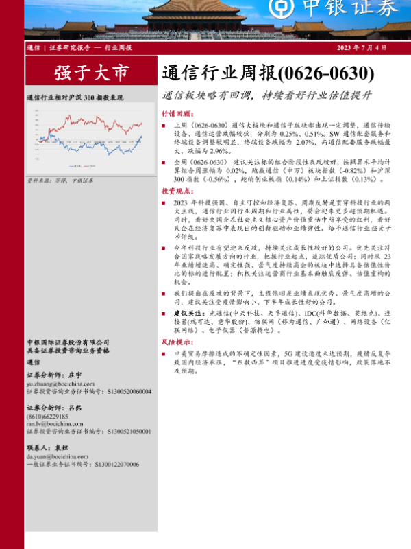 【中银证券】【20230704】20230704-中银证券-通信行业周报:通信板块略有回调,持续看好行业估值提升-17页