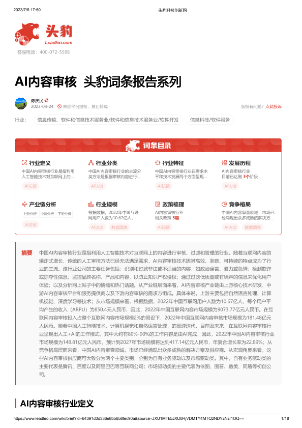 【头豹研究院】【20230424】AI内容审核 头豹词条报告系列-18页