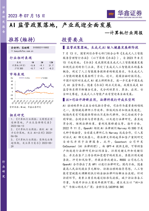 【华鑫证券】【20230715】20230715-华鑫证券-计算机行业周报:AI监管政策落地,产业或迎全面发展-23页
