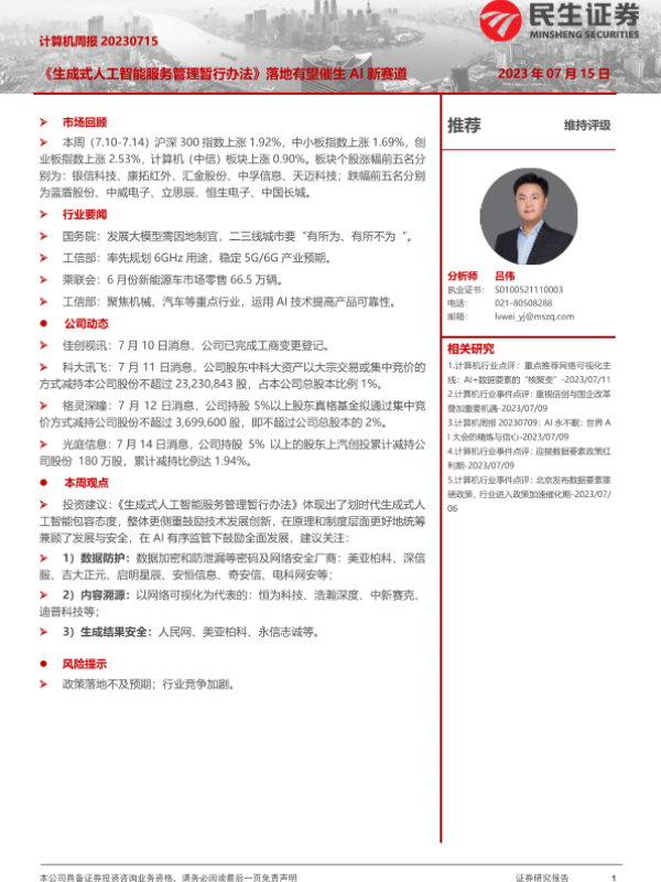 【民生证券】【20230715】20230715-民生证券-计算机周报:《生成式人工智能服务管理暂行办法》落地有望催生AI新赛道-18页