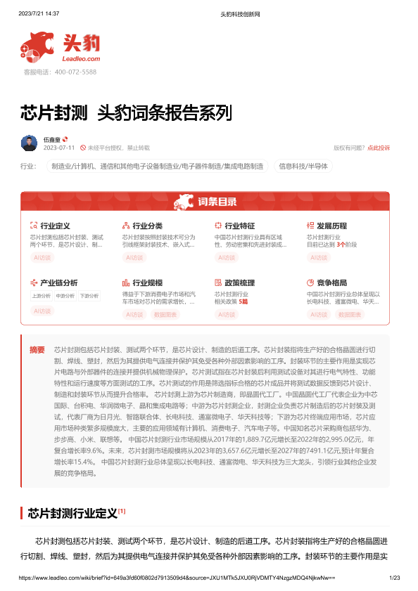 【头豹研究院】【20230721】芯片封测 头豹词条报告系列-23页