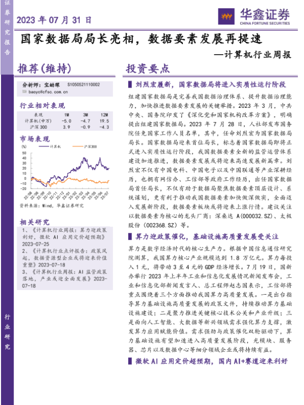 【华鑫证券】【20230731】20230731-华鑫证券-计算机行业周报:国家数据局局长亮相,数据要素发展再提速-24页