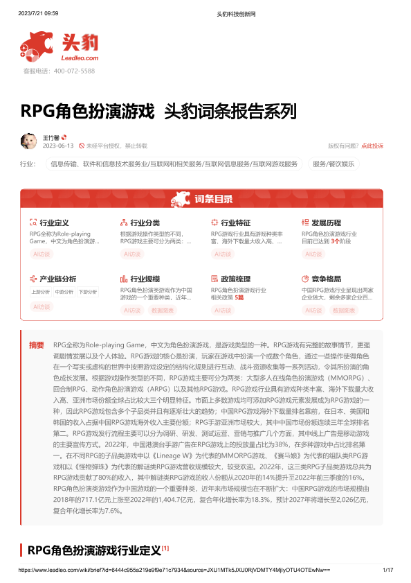 【头豹研究院】【20230613】RPG角色扮演游戏 头豹词条报告系列-17页