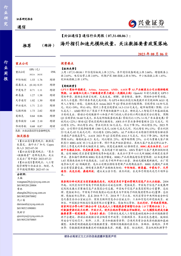 【兴业证券】【20230806】通信行业周报:海外指引加速光模块放量,关注数据要素政策落地-21页