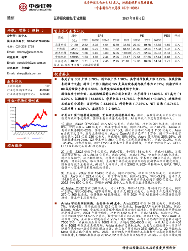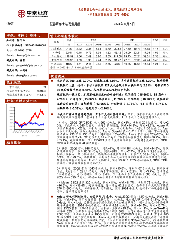 【中泰证券】【20230806】中泰通信行业周报:北美科技巨头加大AI投入,持续看好算力基础设施-14页