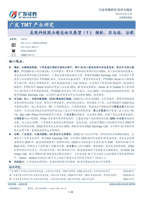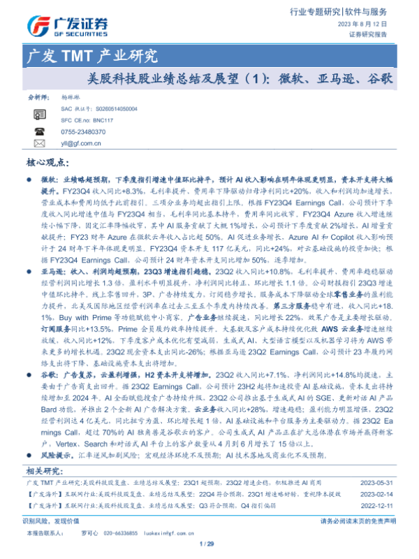 【广发证券】【20230812】美股科技股业绩总结及展望(1):微软、亚马逊、谷歌-29页