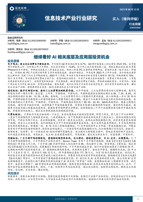 【国金证券】【20230813】信息技术产业行业研究:继续看好AI相关底层及应用层投资机会-25页