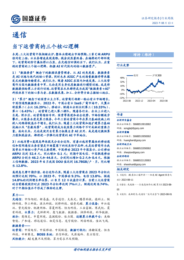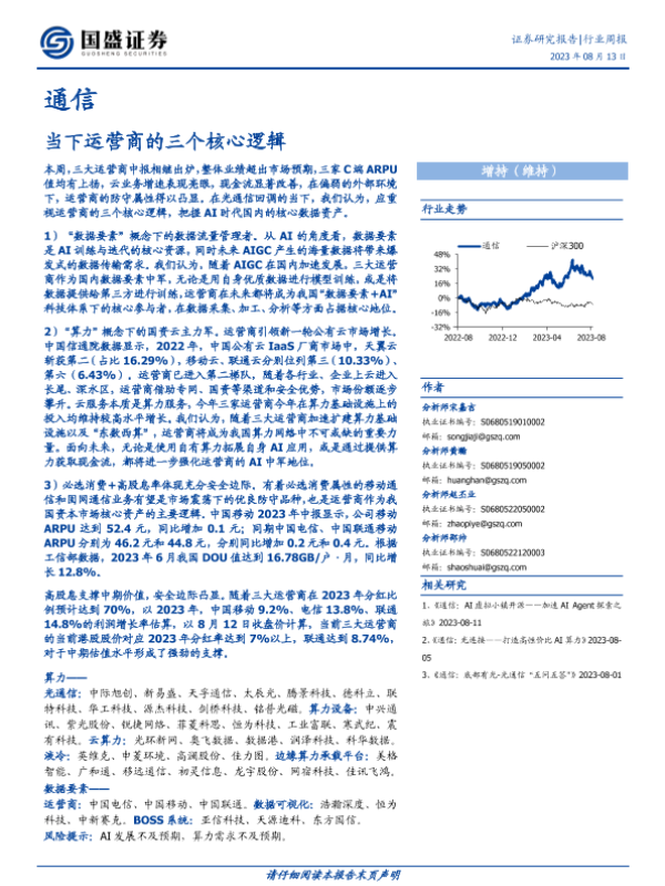 【国盛证券】【20230813】20230813-国盛证券-通信行业周报:当下运营商的三个核心逻辑-17页