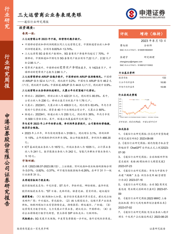 【申港证券】【20230813】20230813-申港证券-通信行业研究周报:三大运营商云业务表现亮眼-11页