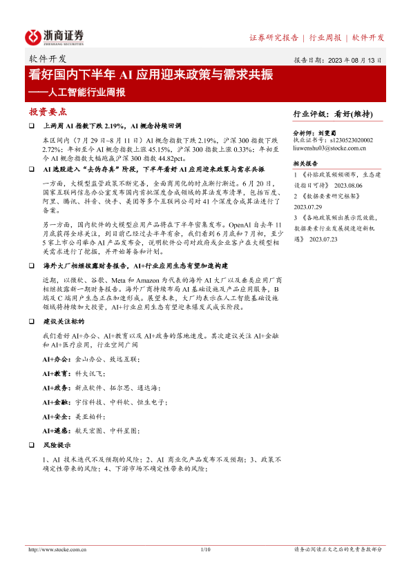 【浙商证券】【20230813】20230813-浙商证券-人工智能行业周报:看好国内下半年AI应用迎来政策与需求共振-10页