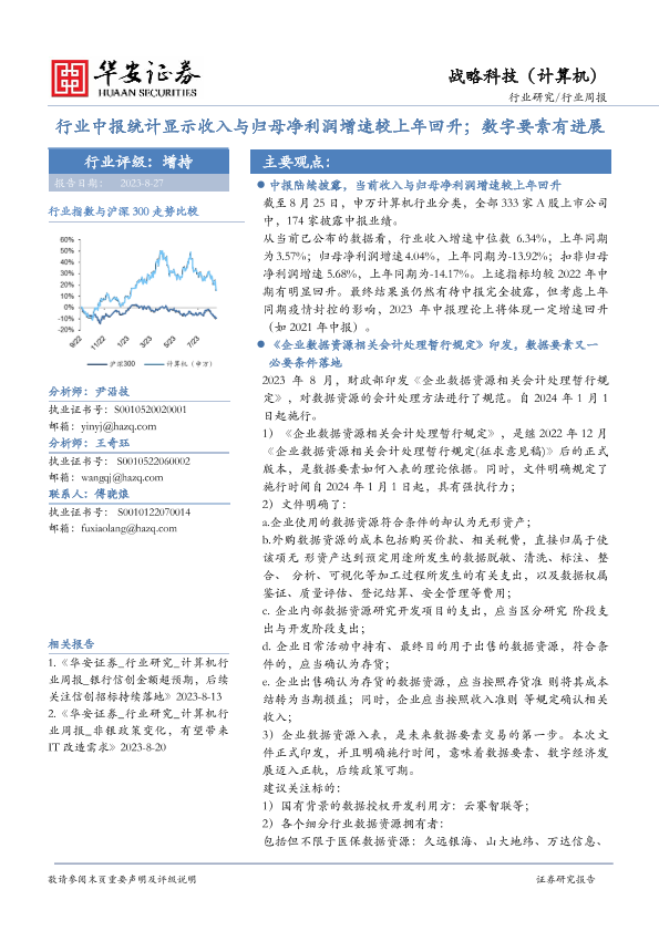【华安证券】【20230827】20230827-华安证券-计算机行业周报:行业中报统计显示收入与归母净利润增速较上年回升;数字要素有进展-17页