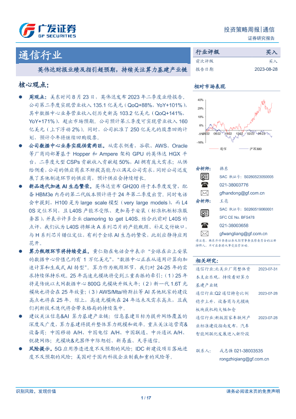 【广发证券】【20230828】20230828-广发证券-通信行业投资策略周报:英伟达财报业绩及指引超预期,持续关注算力基建产业链-17页