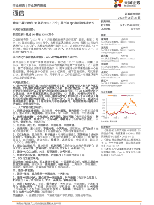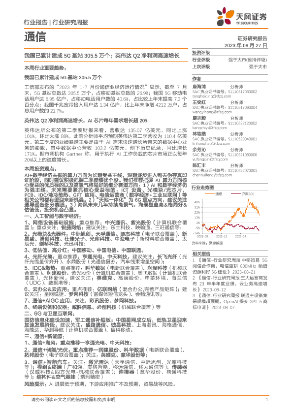 【天风证券】【20230827】20230827-天风证券-通信行业研究周报:我国已累计建成5G基站305.5万个;英伟达Q2净利润高速增长-12页