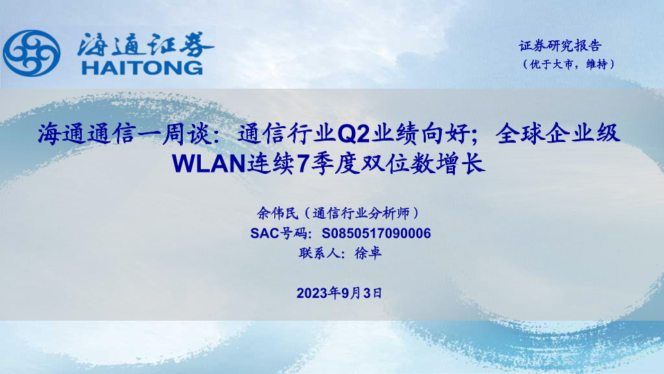 【海通证券】【20230903】海通通信一周谈:通信行业Q2业绩向好;全球企业级WLAN连续7季度双位数增长-12页