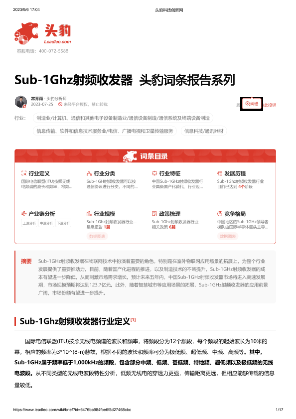 【头豹研究院】【20230906】20230906-头豹研究院-Sub-1Ghz射频收发器 头豹词条报告系列-17页