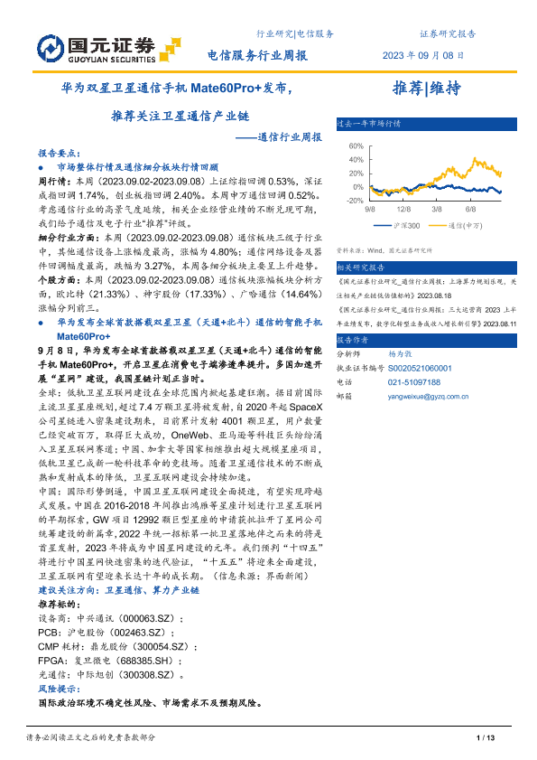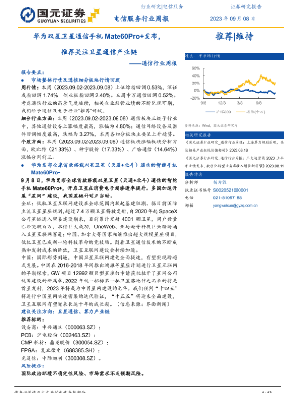【国元证券】【20230908】通信行业周报:华为双星卫星通信手机Mate60Pro+发布,推荐关注卫星通信产业链-13页