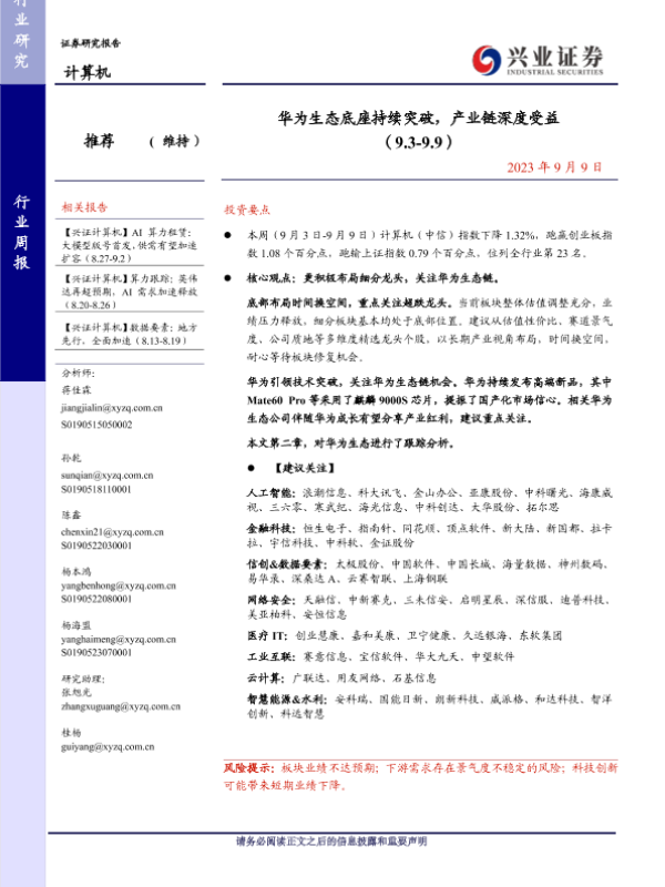 产业链分析 技术突破 行业周报 计算机行业 华为生态