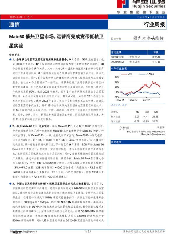 【华金证券】【20230910】通信行业周报:Mate60催热卫星市场,运营商完成宽带低轨卫星实验-21页