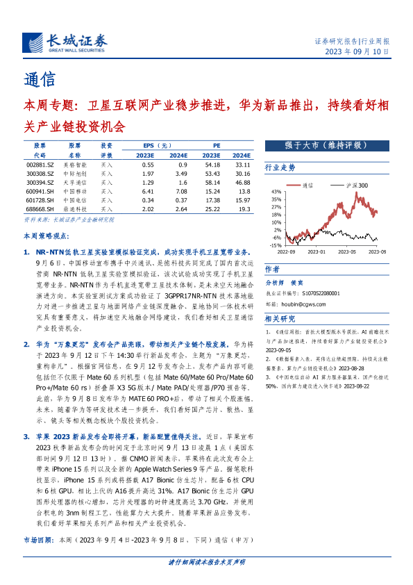 【长城证券】【20230910】通信本周专题:卫星互联网产业稳步推进,华为新品推出,持续看好相关产业链投资机会-15页
