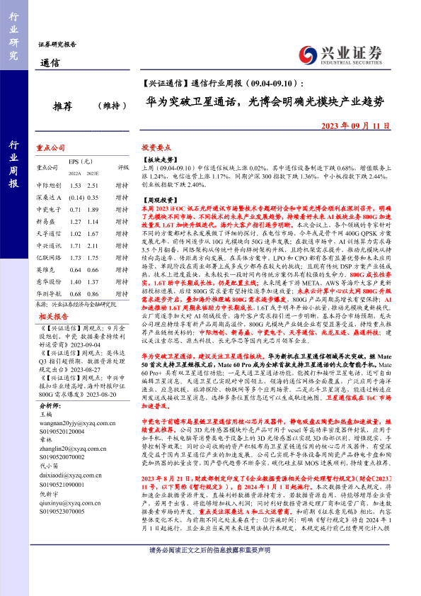 【兴业证券】【20230911】通信行业周报:华为突破卫星通话,光博会明确光模块产业趋势-18页