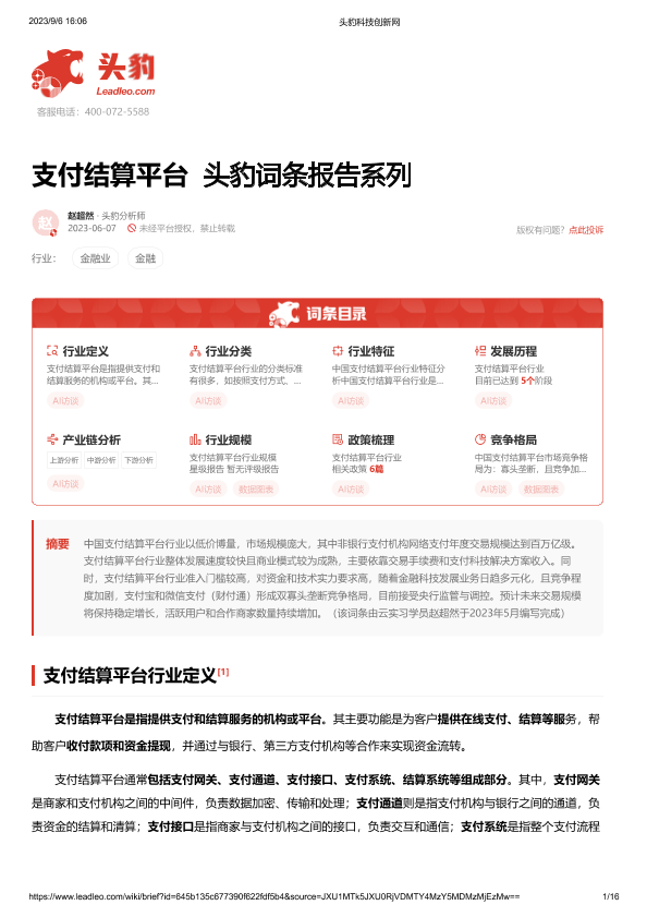 【头豹研究院】【20230914】支付结算平台 头豹词条报告系列-16页