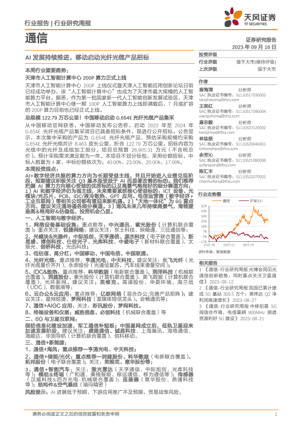【天风证券】【20230916】通信行业研究周报:AI发展持续推进,移动启动光纤光缆产品招标-12页