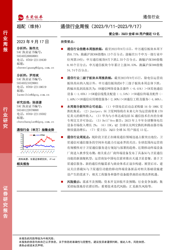 【东莞证券】【20230917】通信行业周报:爱立信:2Q23全球5G用户接近13亿-13页