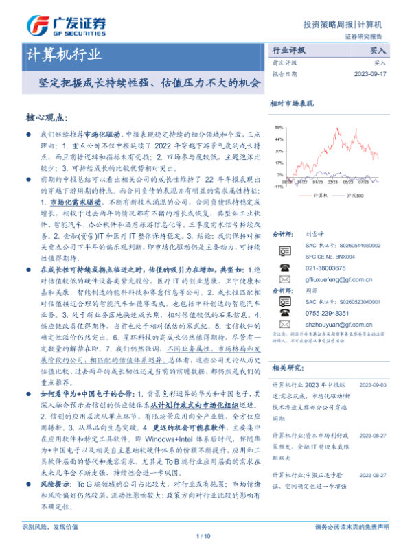 【广发证券】【20230917】20230917-广发证券-计算机行业投资策略周报:坚定把握成长持续性强、估值压力不大的机会-10页