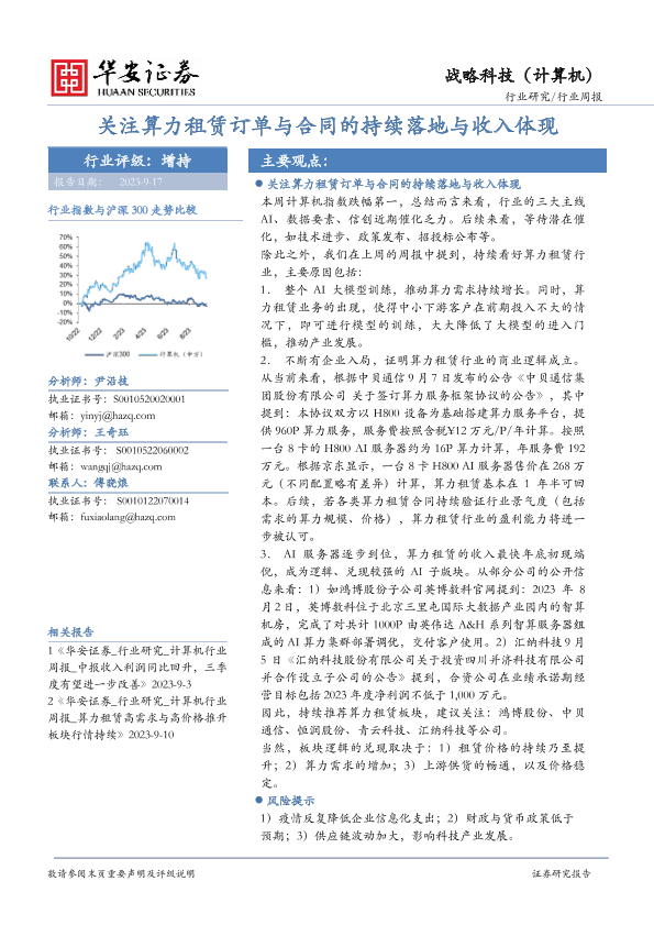 【华安证券】【20230917】20230917-华安证券-战略科技(计算机)行业周报:关注算力租赁订单与合同的持续落地与收入体现-14页