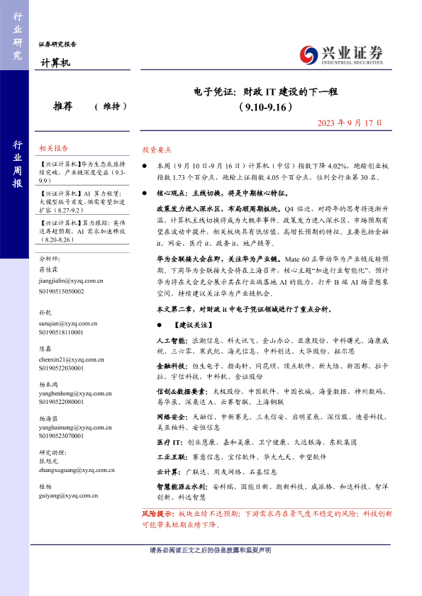 华为产业链 政策发力 电子凭证 计算机行业 财政IT建设