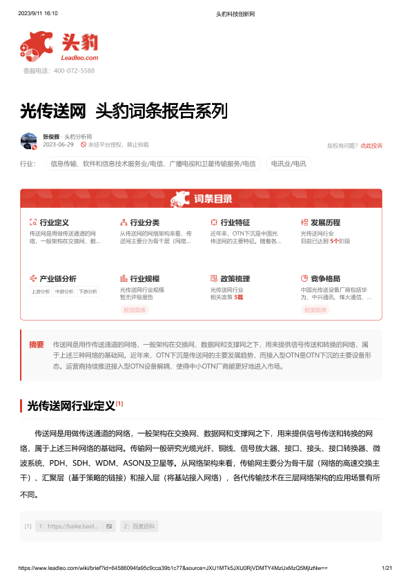 【头豹研究院】【20230921】光传送网 头豹词条报告系列-21页