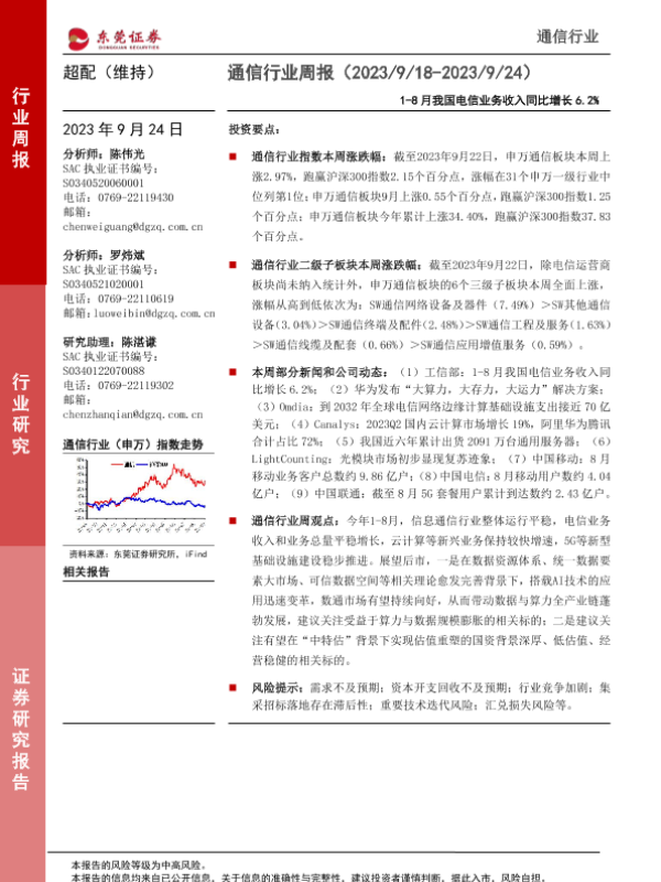 【东莞证券】【20230924】通信行业周报:1-8月我国电信业务收入同比增长6.2%-13页