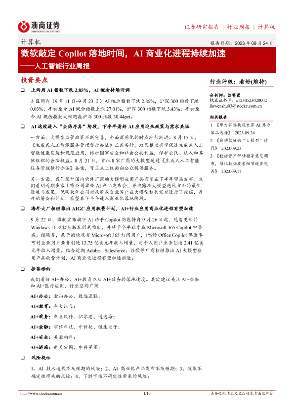 【浙商证券】【20230924】20230924-浙商证券-人工智能行业周报:微软敲定Copilot落地时间,AI商业化进程持续加速-10页