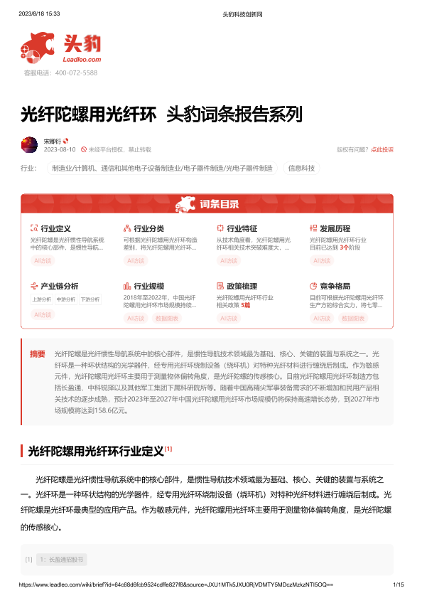 【头豹研究院】【20230810】光纤陀螺用光纤环 头豹词条报告系列-15页