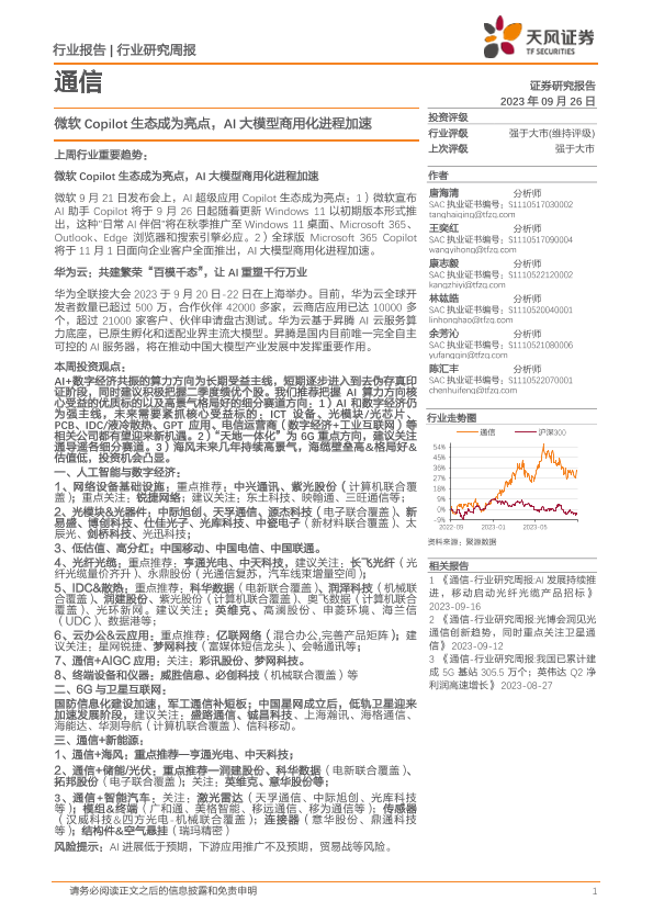 【天风证券】【20230926】20230926-天风证券-通信行业研究周报:微软Copilot生态成为亮点,AI大模型商用化进程加速-12页