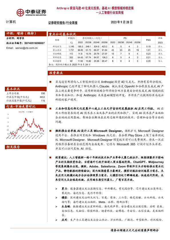 【中泰证券】【20230928】Anthropic获亚马逊40亿美元投资,基础AI模型领域持续进展-16页