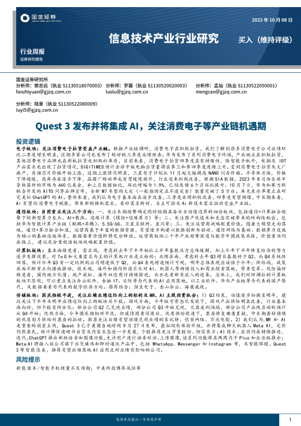 【国金证券】【20231008】信息技术产业行业研究:Quest 3发布并将集成AI,关注消费电子等产业链机遇期-25页