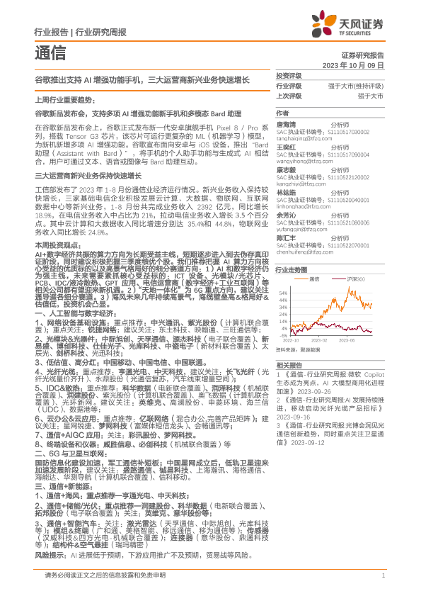 【天风证券】【20231009】20231009-天风证券-通信行业研究周报:谷歌推出支持AI增强功能手机,三大运营商新兴业务快速增长-12页
