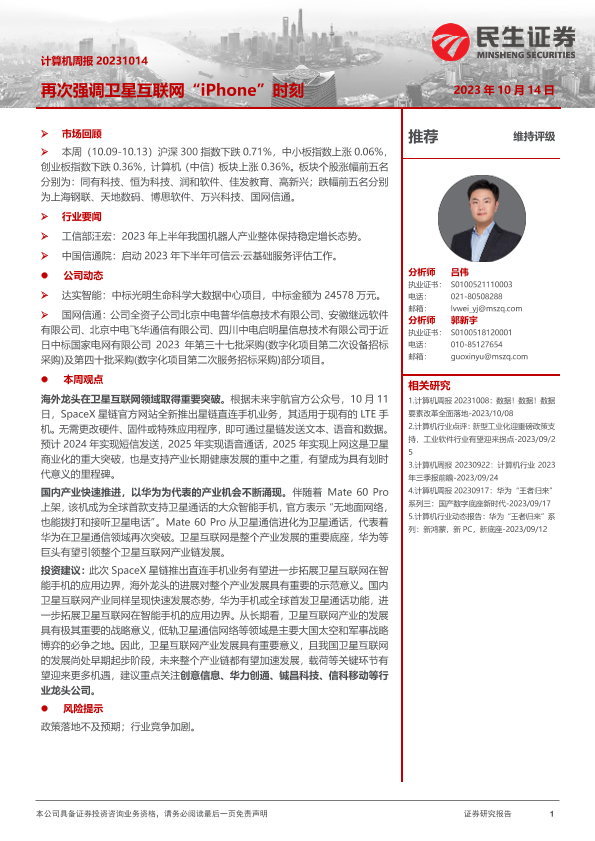 【民生证券】【20231014】20231014-民生证券-计算机周报:再次强调卫星互联网“iPhone”时刻-17页