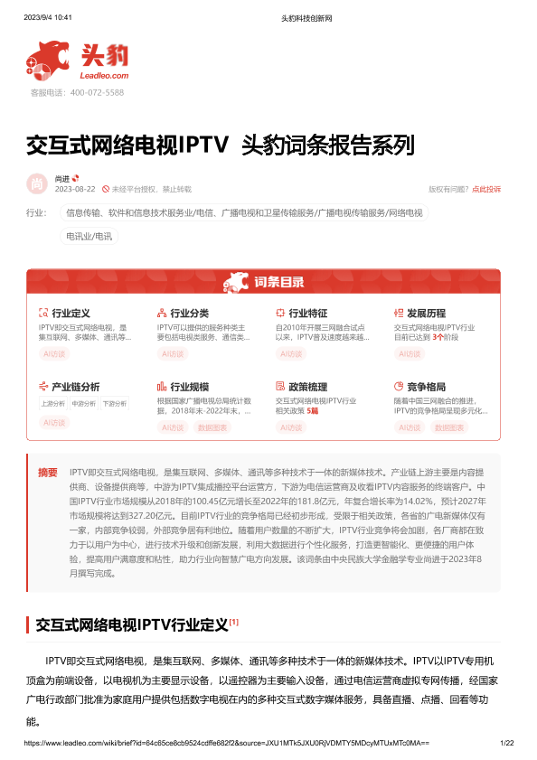 【头豹研究院】【20230822】交互式网络电视IPTV 头豹词条报告系列-22页