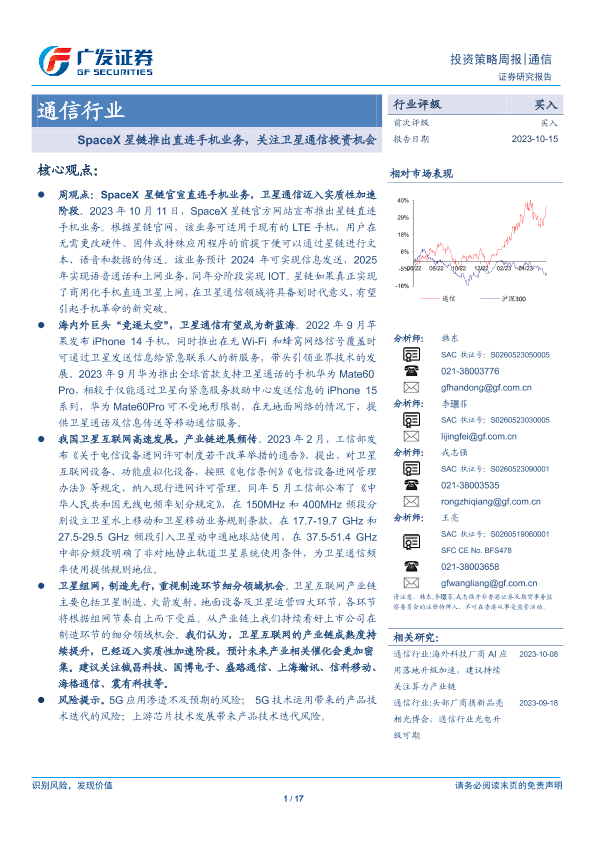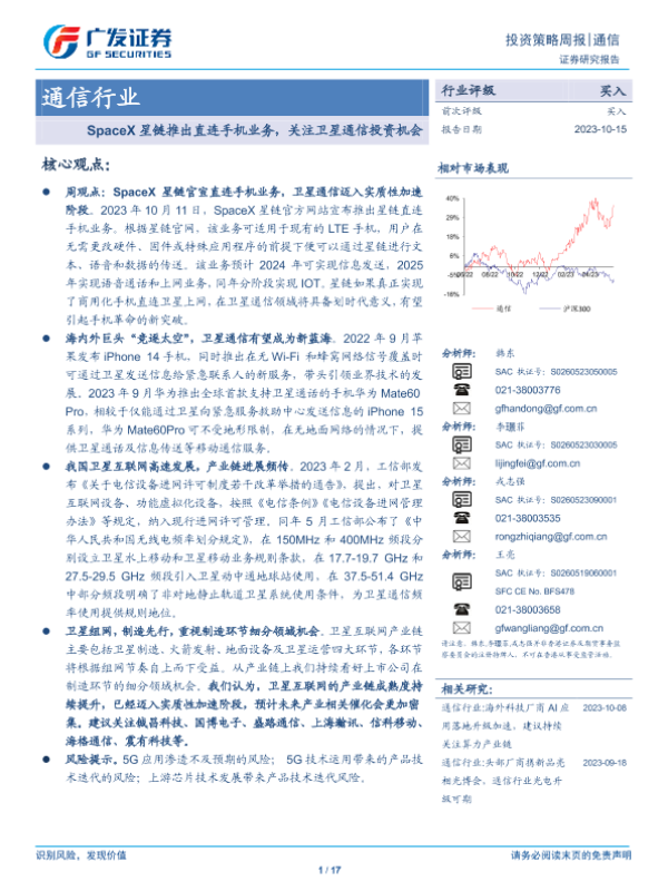 【广发证券】【20231015】20231015-广发证券-通信行业投资策略周报:SpaceX星链推出直连手机业务,关注卫星通信投资机会-17页