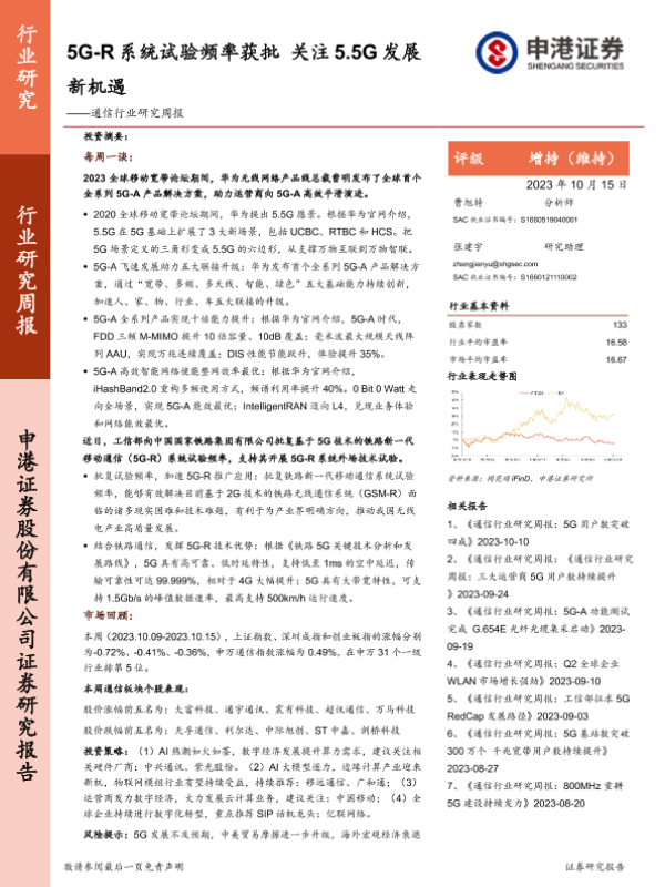 【申港证券】【20231015】20231015-申港证券-通信行业研究周报:5G-R系统试验频率获批 关注5.5G发展新机遇-10页