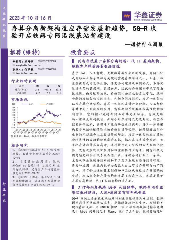 【华鑫证券】【20231016】20231016-华鑫证券-通信行业周报:存算分离新架构适应存储发展新趋势,5G-R试验开启铁路专网沿线基站新建设-33页
