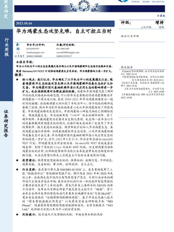 【国泰君安证券】【20231016】20231016-国泰君安-计算机行业周报:华为鸿蒙生态攻坚克难,自主可控正当时-10页