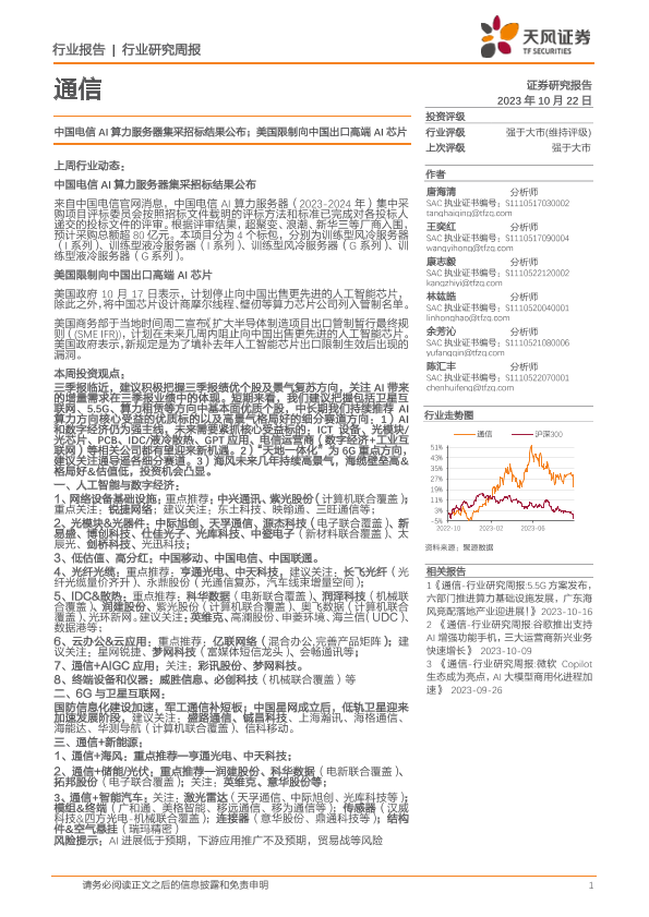 【天风证券】【20231022】通信行业研究周报:中国电信AI算力服务器集采招标结果公布;美国限制向中国出口高端AI芯片-13页