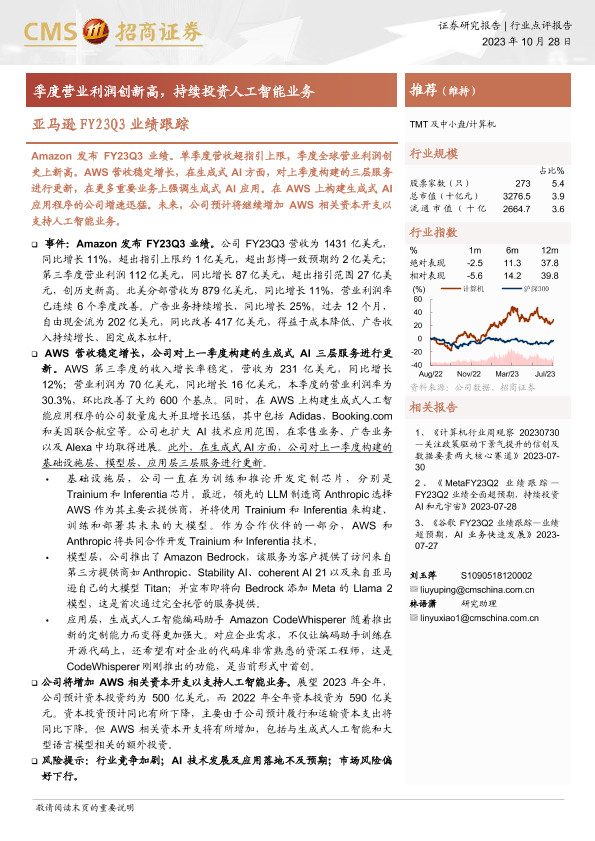 【海通证券】【20231028】亚马逊FY23Q3业绩跟踪-季度营业利润创新高,持续投资人工智能业务-12页